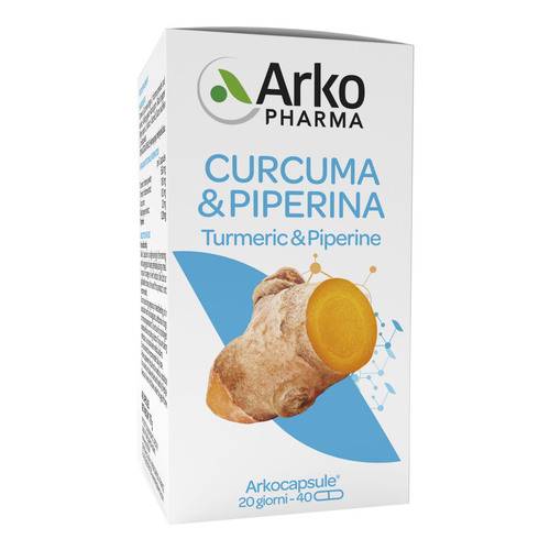 ArkoCURCUMA & PIPERINA Descrizione Integratore alimentare. Ingredienti Polvere ed estratto di rizoma di curcuma (Curcuma longa L.); agente di carica: gomma di acacia; estratto di pepe nero (Piper nigru...