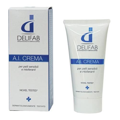 DELIFAB A.I. CREMA Emulsione ad azione emolliente, lenitiva e disarrossante. Idrata e lenisce le pelli fragili ed intolleranti, riduce il prurito e favorisce il ripristino del giusto equilibrio cutaneo. Difende la pelle dagli agenti atmosferici (radiazioni UV in particolare) esplicando un'azione preventiva della formazione delle rughe.