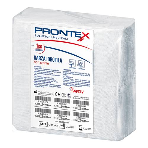 PRONTEXDescrizione Compresse non sterili puro cotone idrofilo - tit. 12/8 F.U. Confezione in cellophane termoretratto. Maggiore resistenza ed igiene. Formato 20 x 20 cm. Cod. 15720