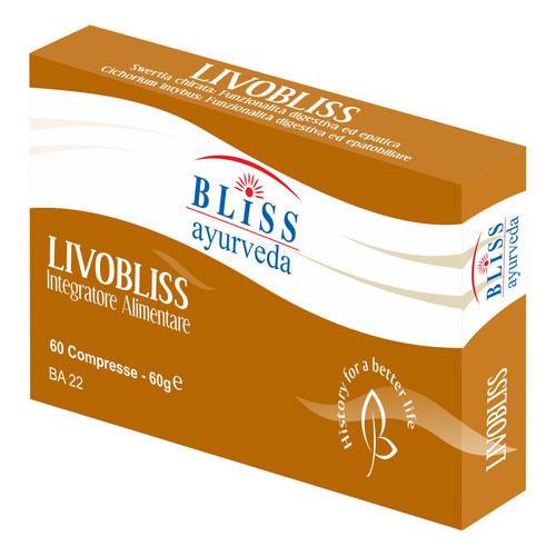 LIVOBLISSDescrizione Integratore alimentare prodotto con piante dell'antica tradizione Ayurvedica. Swertia chirata: funzionalità digestiva ed epatica. Cichorium intybus: funzionalità digestiva ed epato...