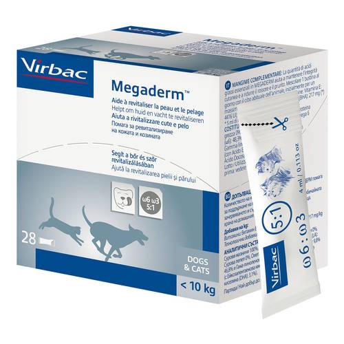 MegadermDescrizione Mangime complementare per cani e gatti. Supplemento nutrizionale che contiene acidi grassi essenziali (AGE) di elevata qualità, appartenenti alla famiglia degli omega 6 (w6) e omega 3...