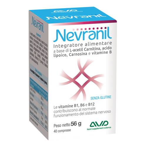 Nevranil Descrizione Integratore alimentare a base di L-acetil carnitina, acido lipoico, carnosina e vitamine B. Le vitamine B1, B6 e B12 contribuiscono al normale funzionamento del sistema nervoso. N...