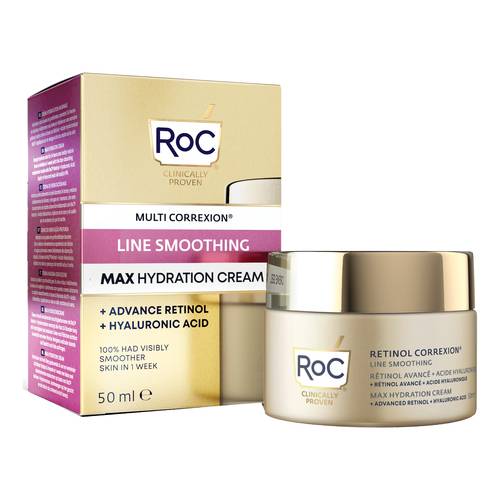 Crema idratante a rapido assorbimento formulata con Retinolo RoC e acido ialuronico per idratare la pelle in profondità per 24 ore e ridurre visibilmente le linee sottili e le rughe.